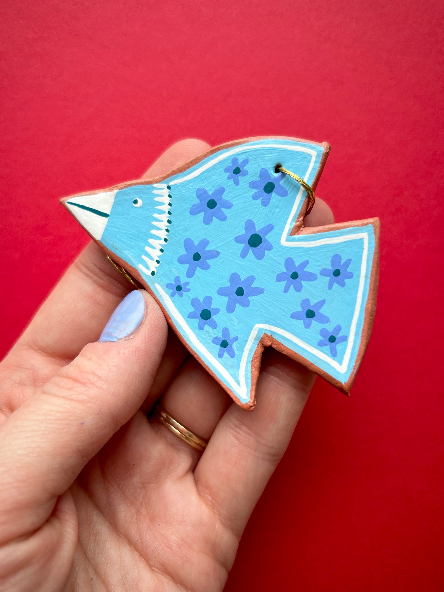 This listing is for one air dry clay bird ornament, hand painted with acryla gouache and sealed with a gentle layer of satin varnish. Ready to hang on your tree, or anywhere! Completely one of a kind. Formed and painted with love, and signed and dated on the back. Please handle with care!