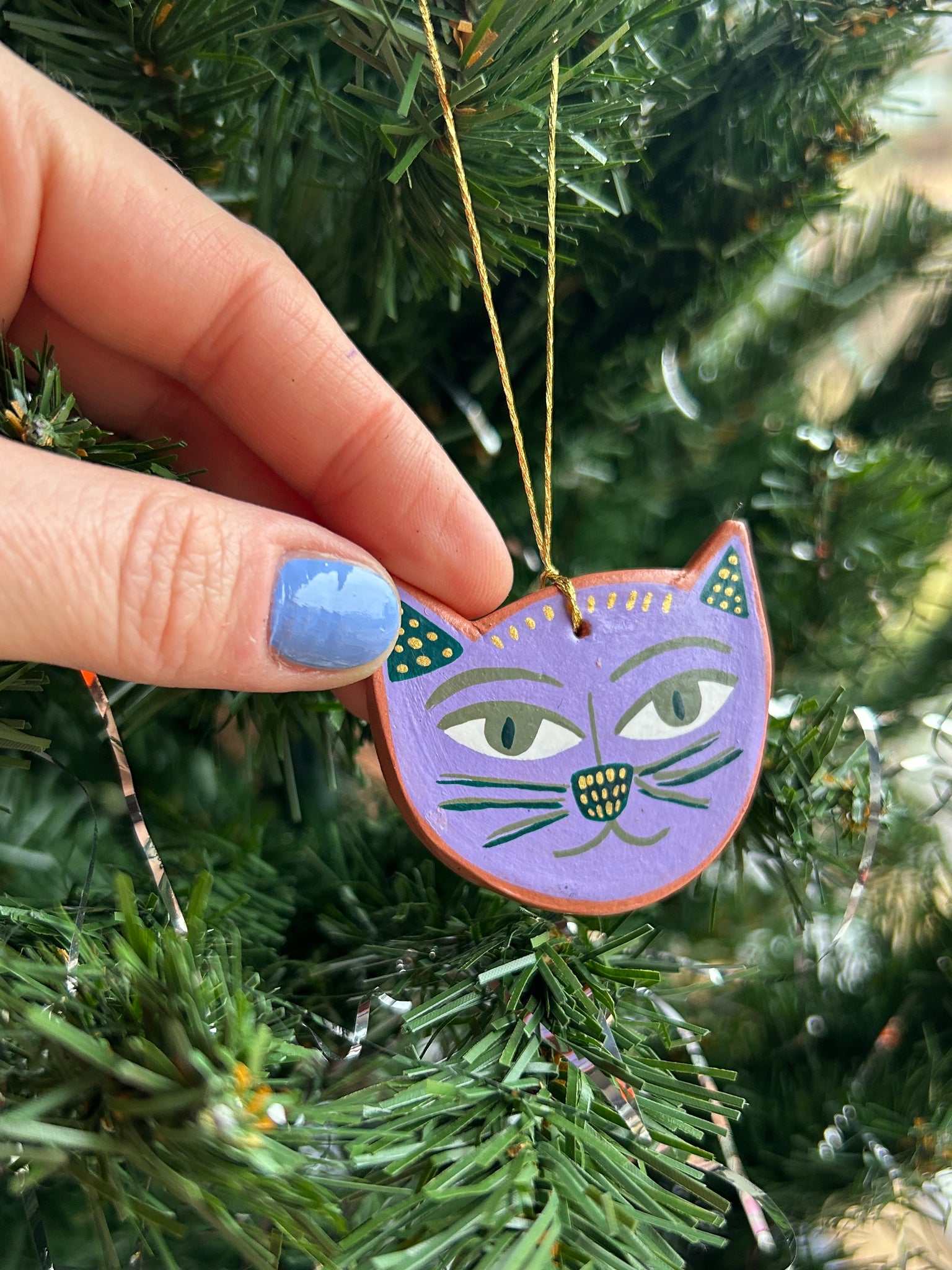 This listing is for one air dry clay cat ornament, handpainted with acrylics and sealed with a gentle layer of satin varnish. Ready to hang on your tree, or anywhere! Completely one of a kind. Formed and painted with love, and signed and dated on the back. Please handle with care!