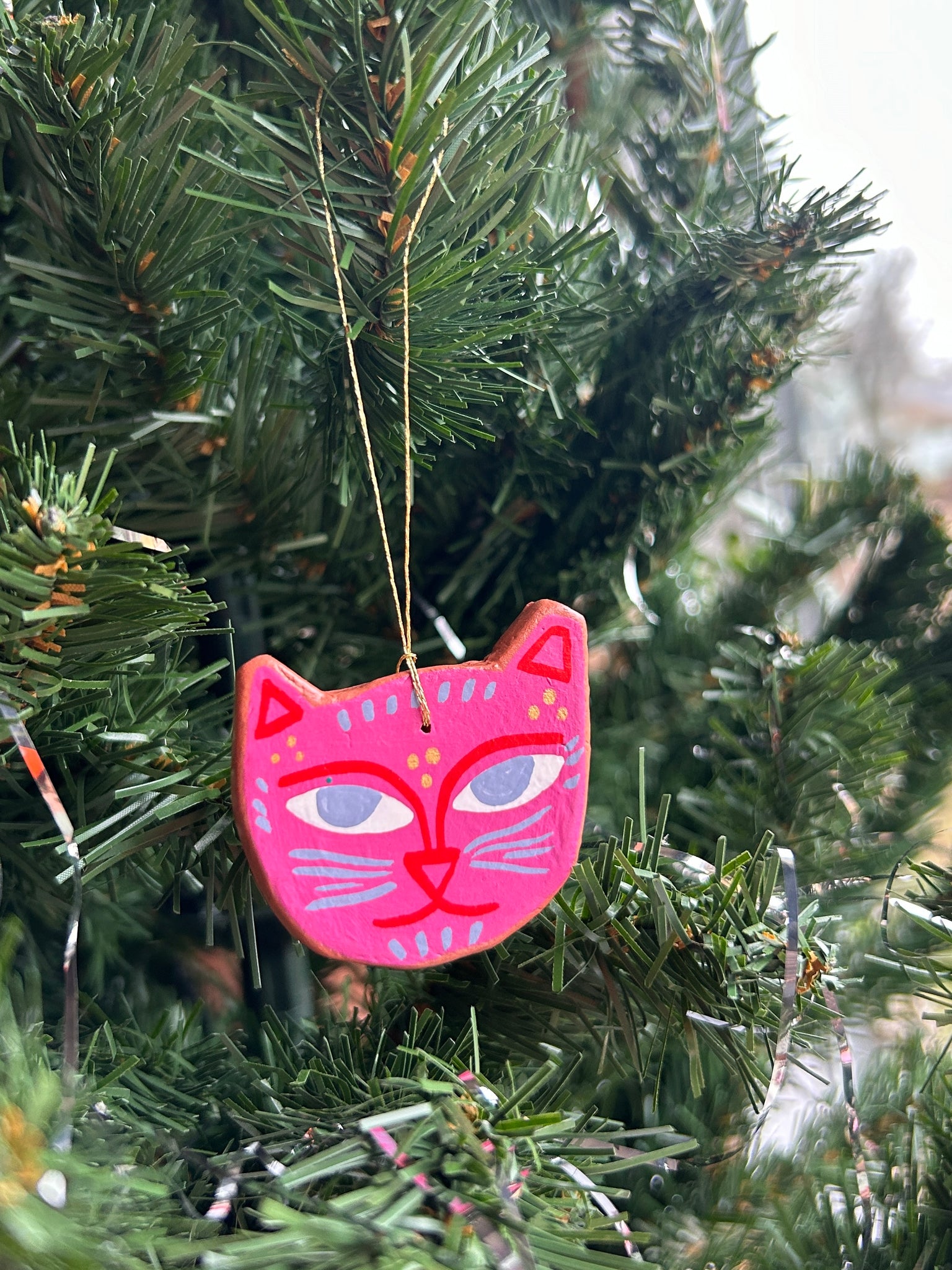 This listing is for one air dry clay cat ornament, handpainted with acrylics and sealed with a gentle layer of satin varnish. Ready to hang on your tree, or anywhere! Completely one of a kind. Formed and painted with love, and signed and dated on the back. Please handle with care!