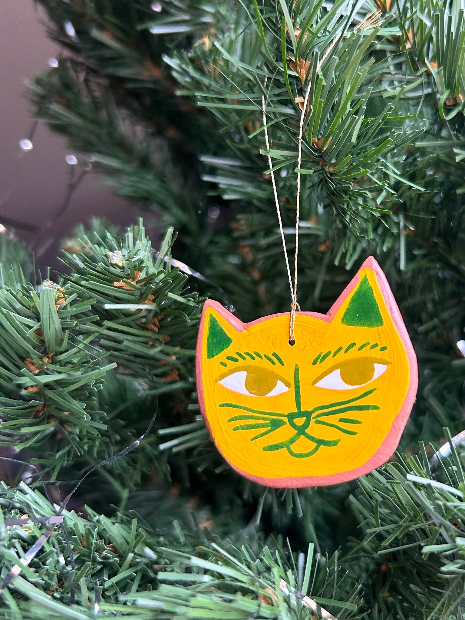 This listing is for one air dry clay cat ornament, handpainted with acrylics and sealed with a gentle layer of satin varnish. Ready to hang on your tree, or anywhere! Completely one of a kind. Formed and painted with love, and signed and dated on the back. Please handle with care!