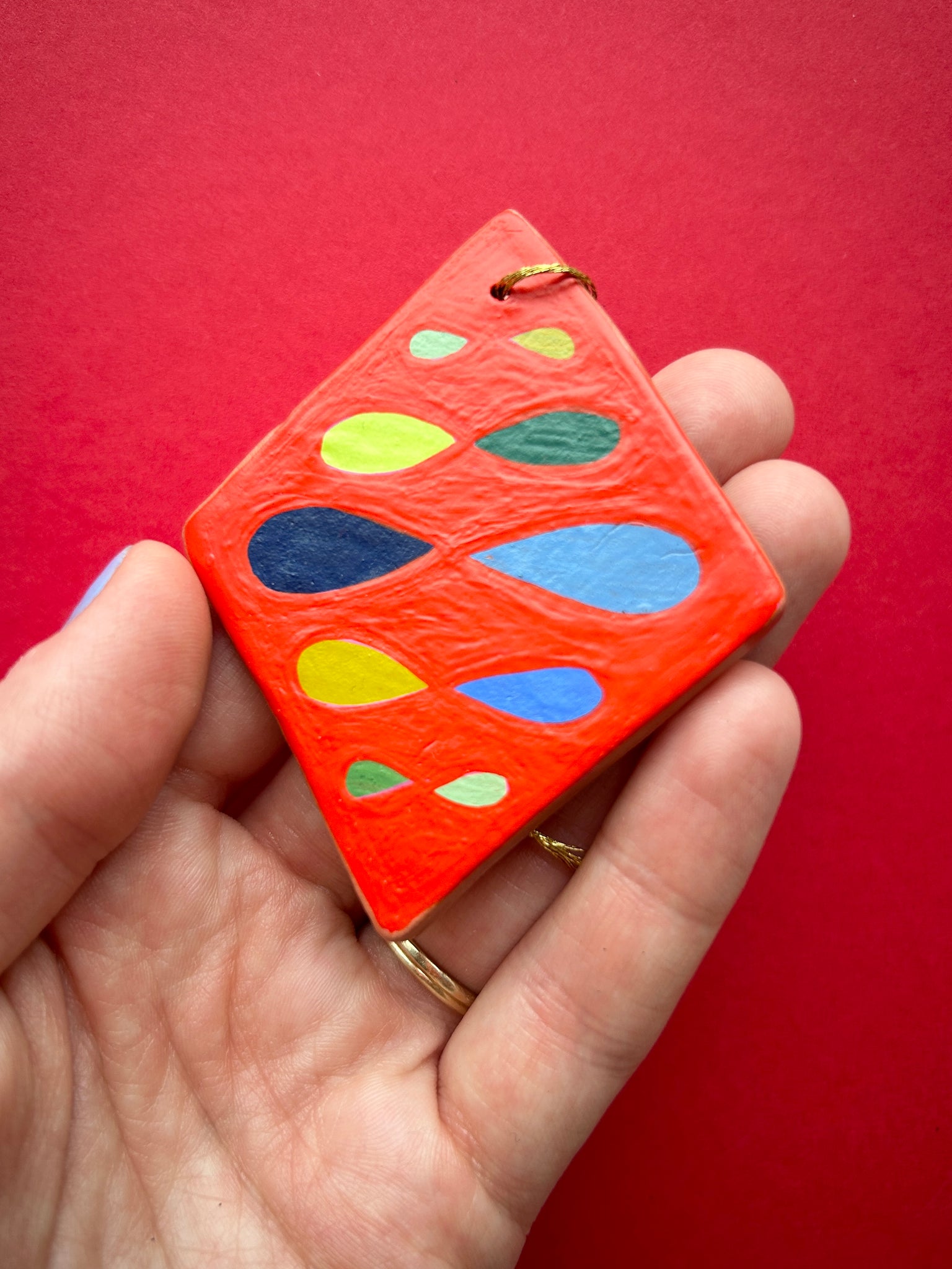 This listing is for one air dry clay diamond ornament, hand painted with acryla gouache and sealed with a gentle layer of satin varnish. Ready to hang on your tree, or anywhere! Completely one of a kind. Formed and painted with love, and signed and dated on the back. Please handle with care!