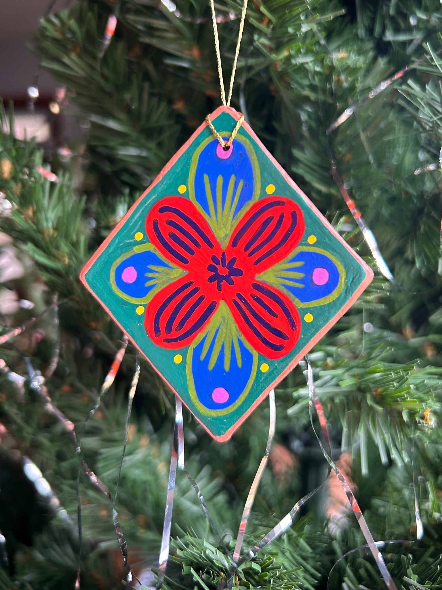 This listing is for one air dry clay diamond ornament, hand painted with acryla gouache and sealed with a gentle layer of satin varnish. Ready to hang on your tree, or anywhere! Completely one of a kind. Formed and painted with love, and signed and dated on the back. Please handle with care!