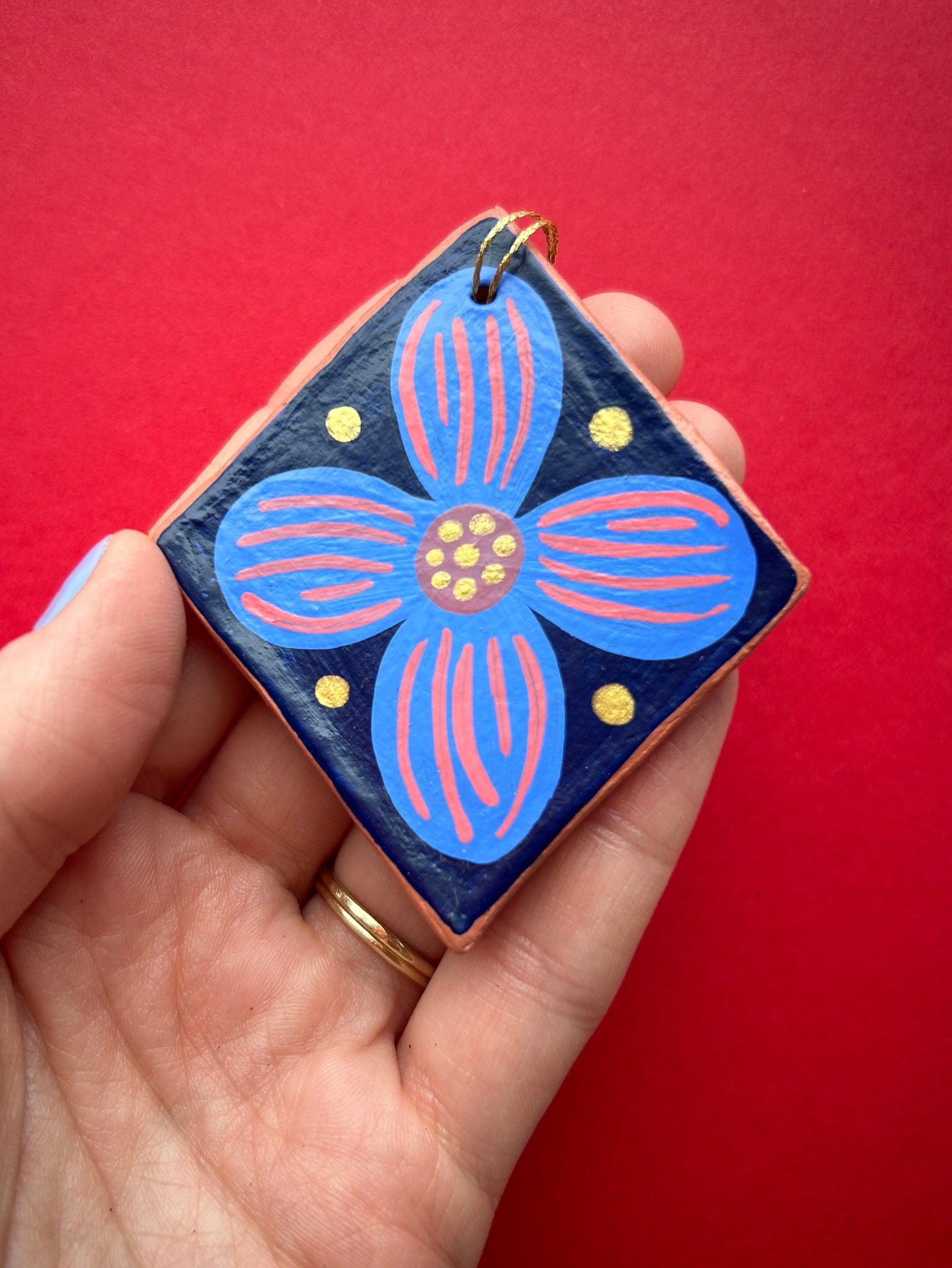 This listing is for one air dry clay diamond ornament, hand painted with acryla gouache and sealed with a gentle layer of satin varnish. Ready to hang on your tree, or anywhere! Completely one of a kind. Formed and painted with love, and signed and dated on the back. Please handle with care!