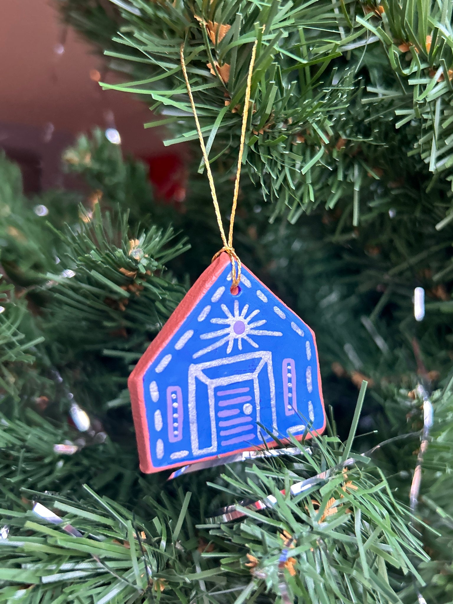 This listing is for one air dry clay house ornament, hand painted with acryla gouache and sealed with a gentle layer of satin varnish. Ready to hang on your tree, or anywhere! Completely one of a kind. Formed and painted with love, and signed and dated on the back. Please handle with care!