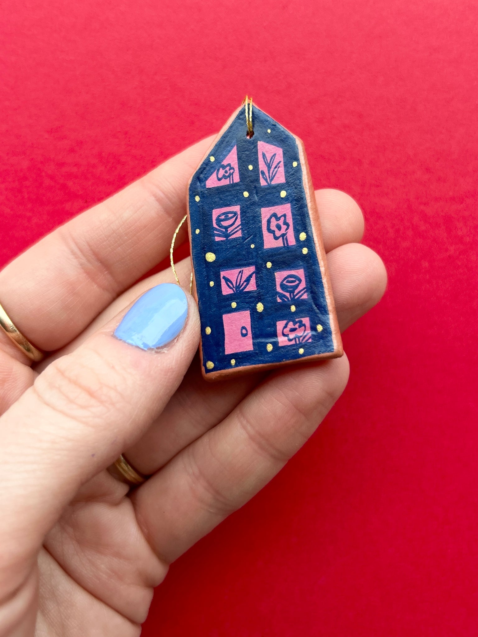 This listing is for one air dry clay house ornament, hand painted with acryla gouache and sealed with a gentle layer of satin varnish. Ready to hang on your tree, or anywhere! Completely one of a kind. Formed and painted with love, and signed and dated on the back. Please handle with care!