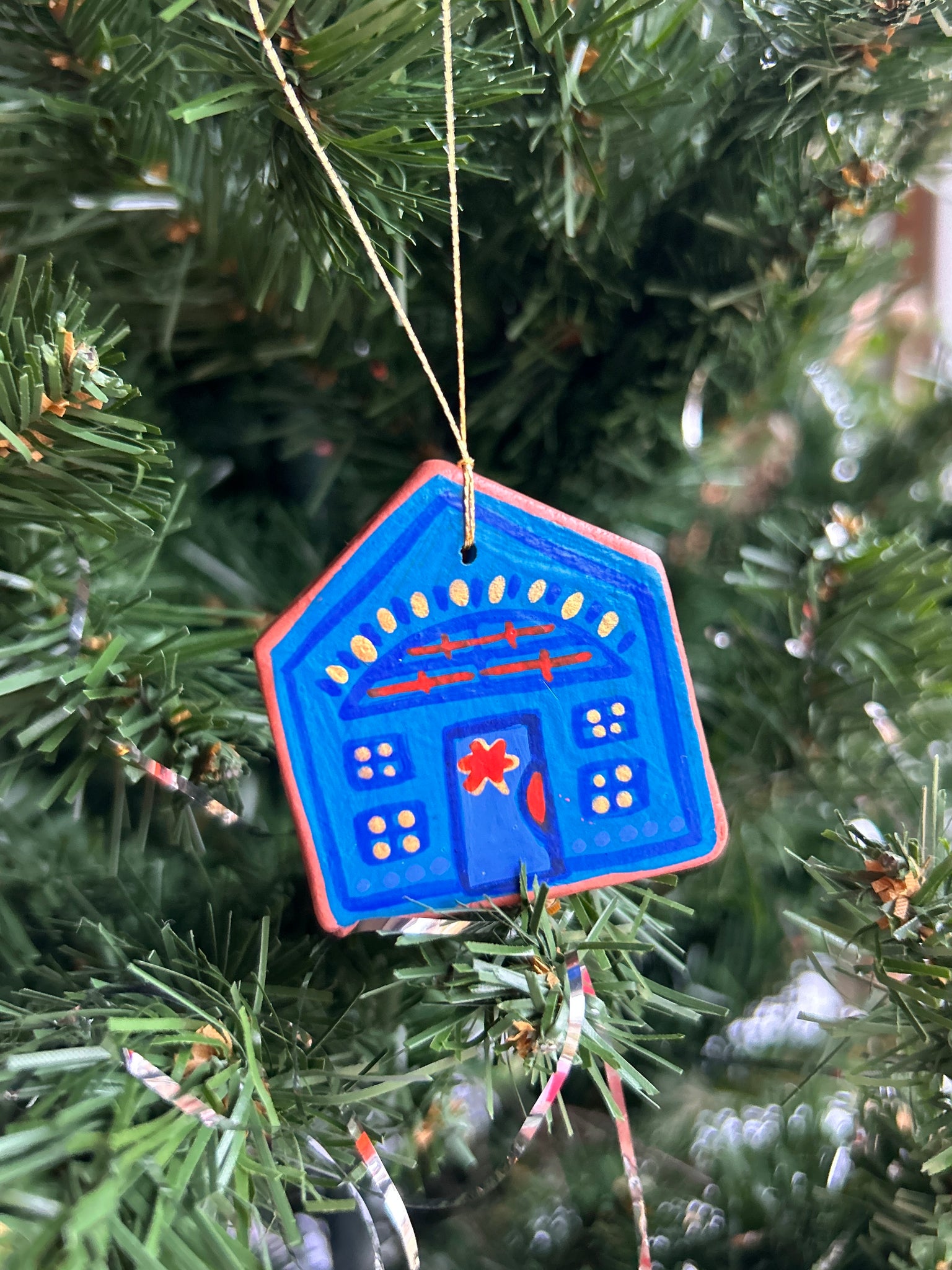 This listing is for one air dry clay house ornament, hand painted with acryla gouache and sealed with a gentle layer of satin varnish. Ready to hang on your tree, or anywhere! Completely one of a kind. Formed and painted with love, and signed and dated on the back. Please handle with care!