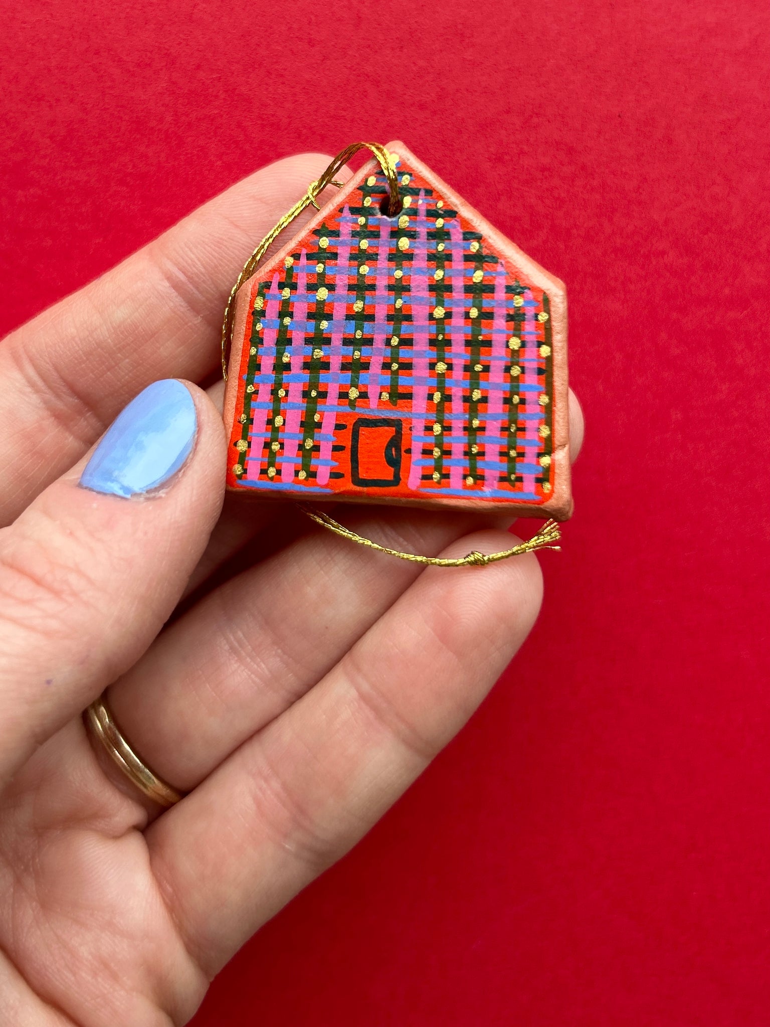 This listing is for one air dry clay house ornament, hand painted with acryla gouache and sealed with a gentle layer of satin varnish. Ready to hang on your tree, or anywhere! Completely one of a kind. Formed and painted with love, and signed and dated on the back. Please handle with care!