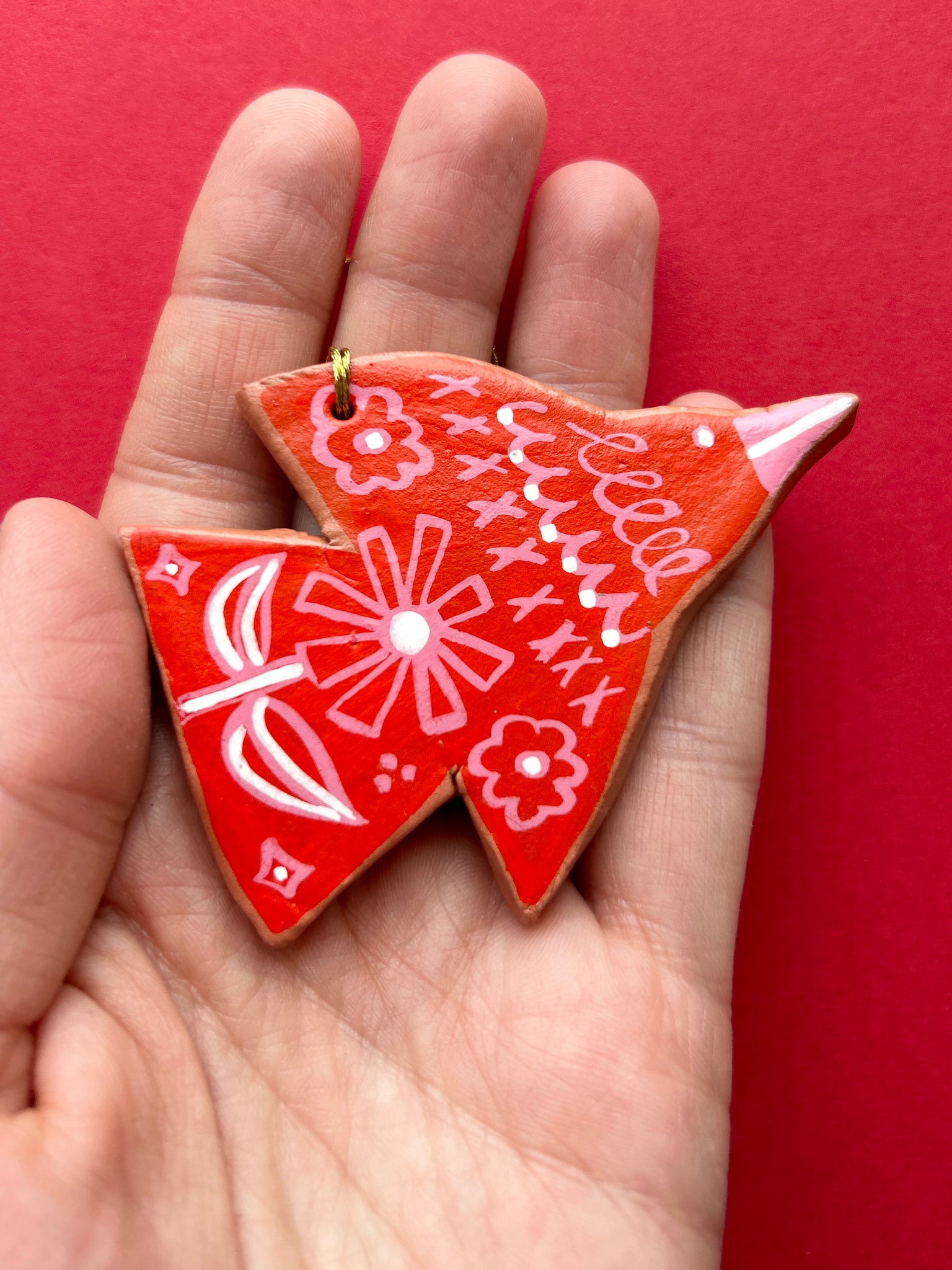 This listing is for one air dry clay bird ornament, hand painted with acryla gouache and sealed with a gentle layer of satin varnish. Ready to hang on your tree, or anywhere! Completely one of a kind. Formed and painted with love, and signed and dated on the back. Please handle with care!