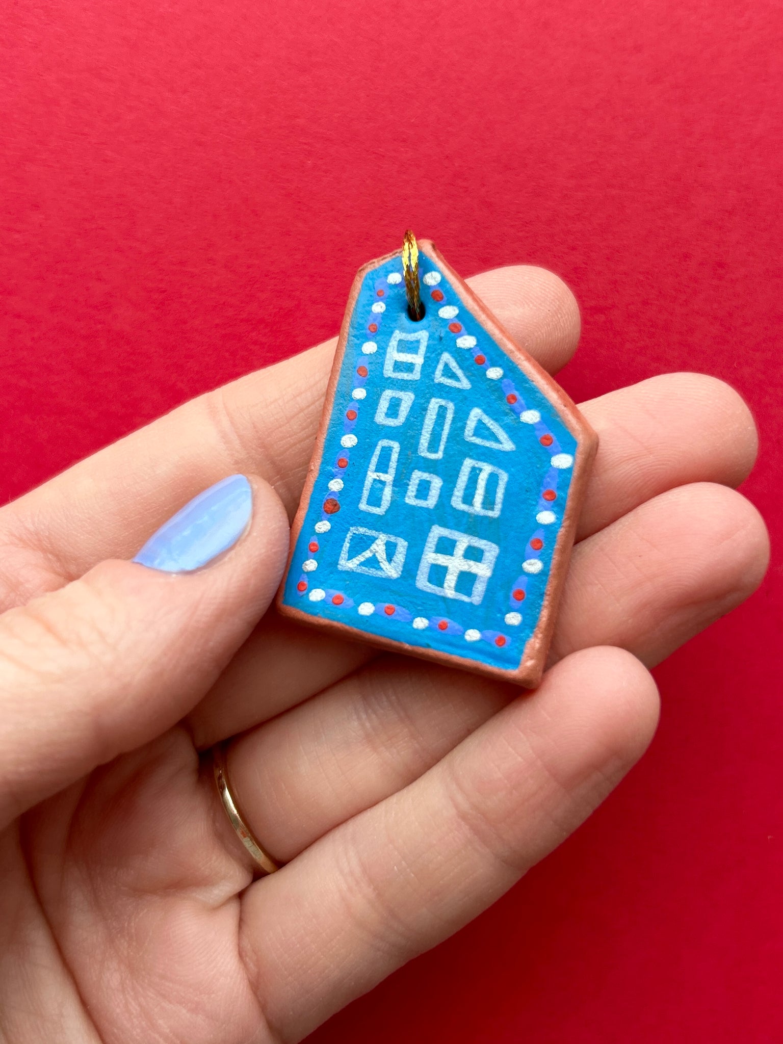 This listing is for one air dry clay house ornament, hand painted with acryla gouache and sealed with a gentle layer of satin varnish. Ready to hang on your tree, or anywhere! Completely one of a kind. Formed and painted with love, and signed and dated on the back. Please handle with care!