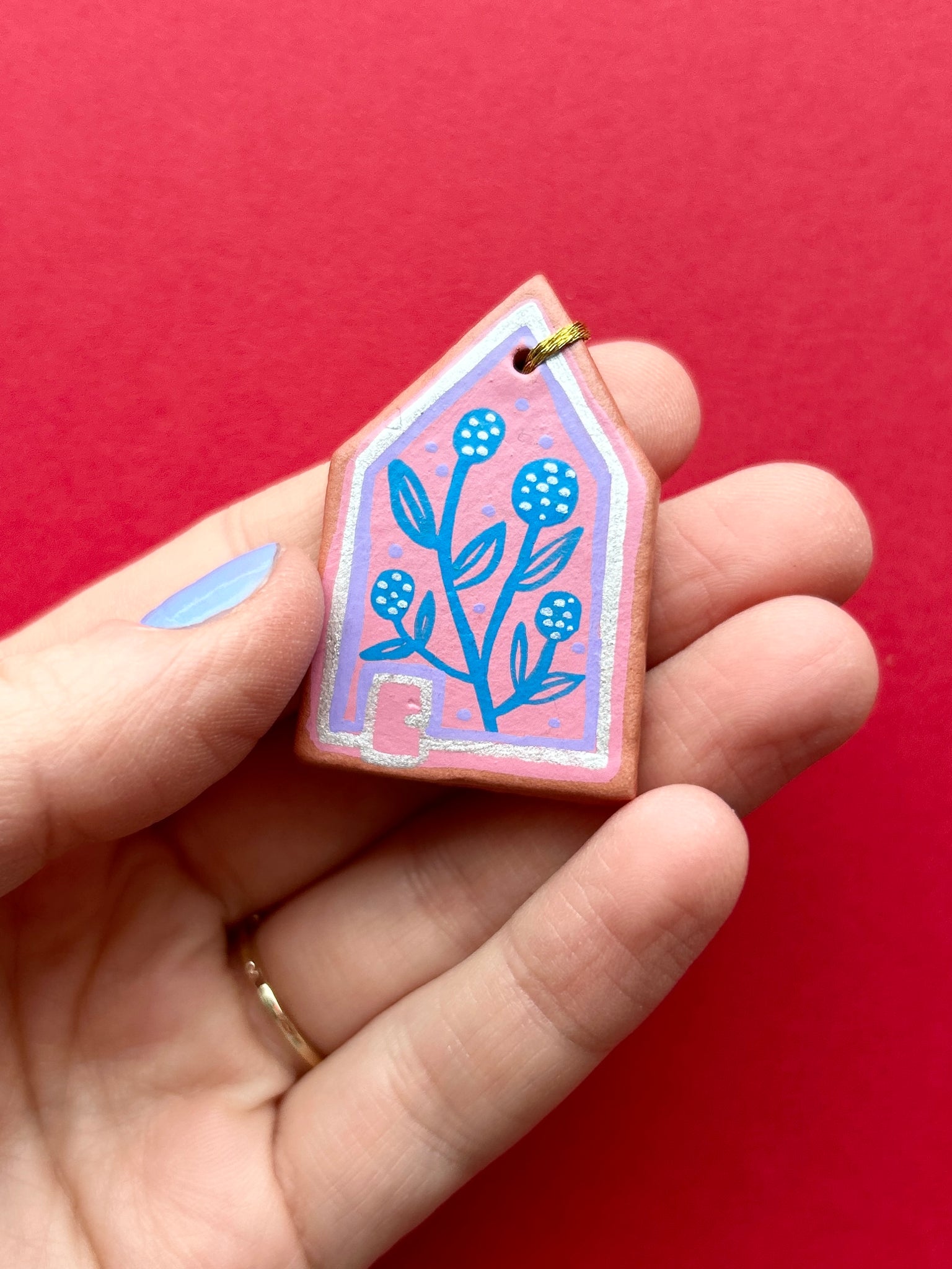 This listing is for one air dry clay house ornament, hand painted with acryla gouache and sealed with a gentle layer of satin varnish. Ready to hang on your tree, or anywhere! Completely one of a kind. Formed and painted with love, and signed and dated on the back. Please handle with care!