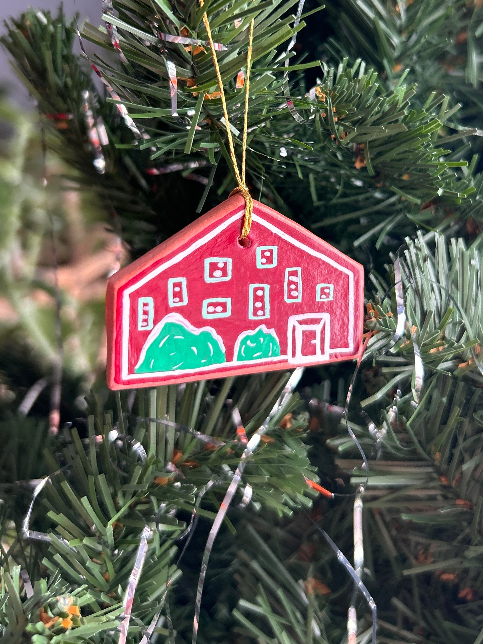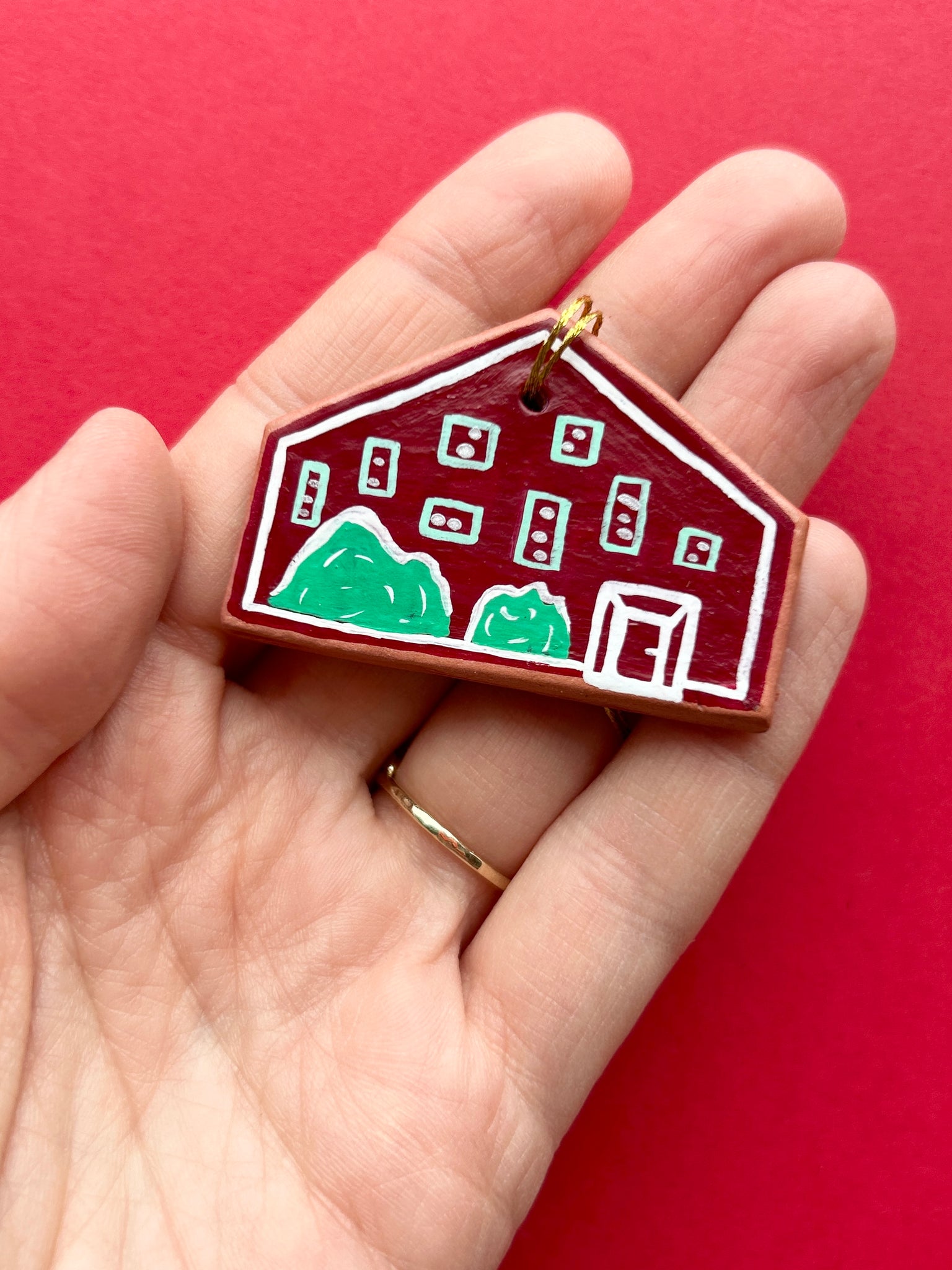 This listing is for one air dry clay house ornament, hand painted with acryla gouache and sealed with a gentle layer of satin varnish. Ready to hang on your tree, or anywhere! Completely one of a kind. Formed and painted with love, and signed and dated on the back. Please handle with care!