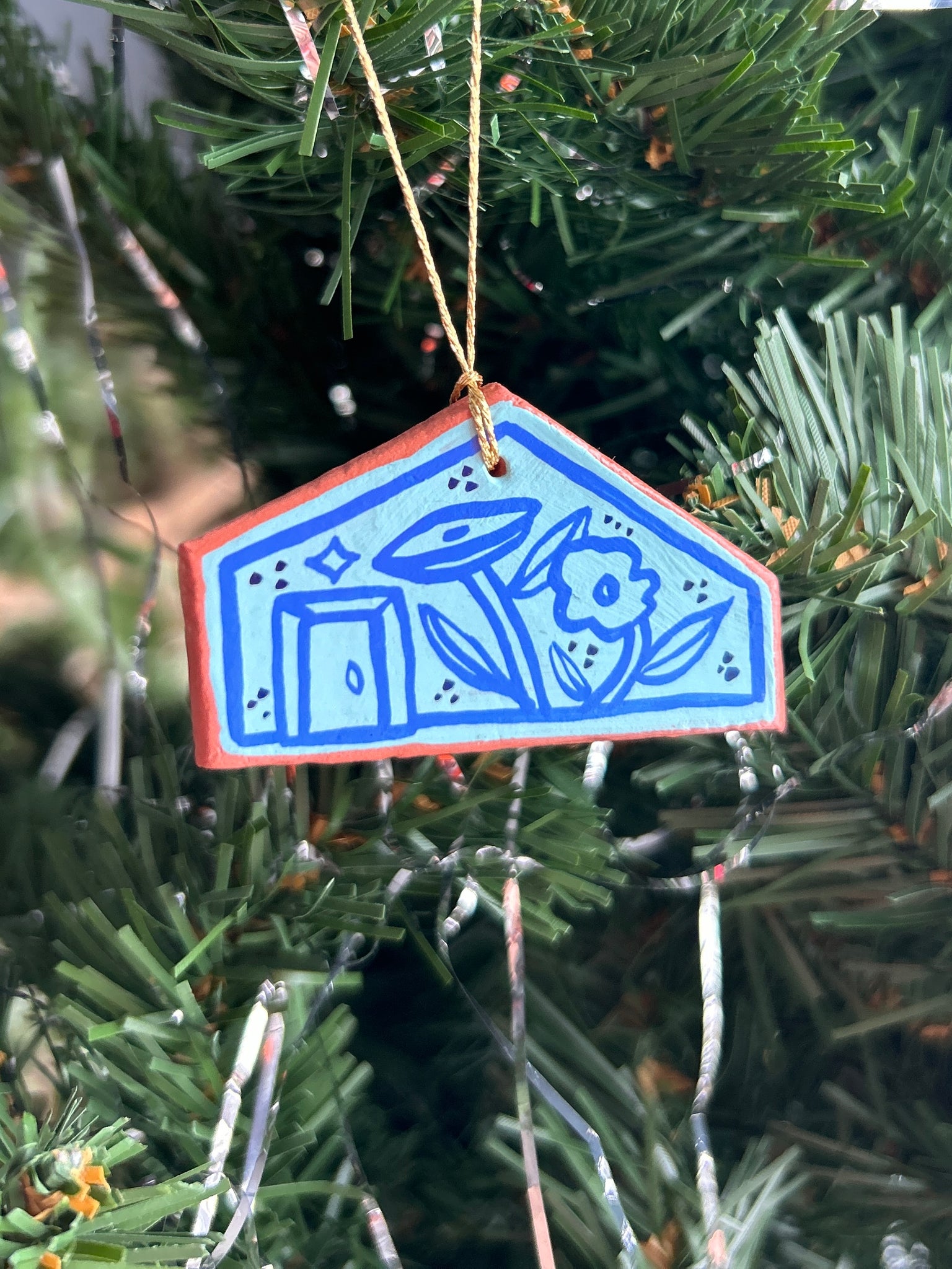 This listing is for one air dry clay house ornament, hand painted with acryla gouache and sealed with a gentle layer of satin varnish. Ready to hang on your tree, or anywhere! Completely one of a kind. Formed and painted with love, and signed and dated on the back. Please handle with care!
