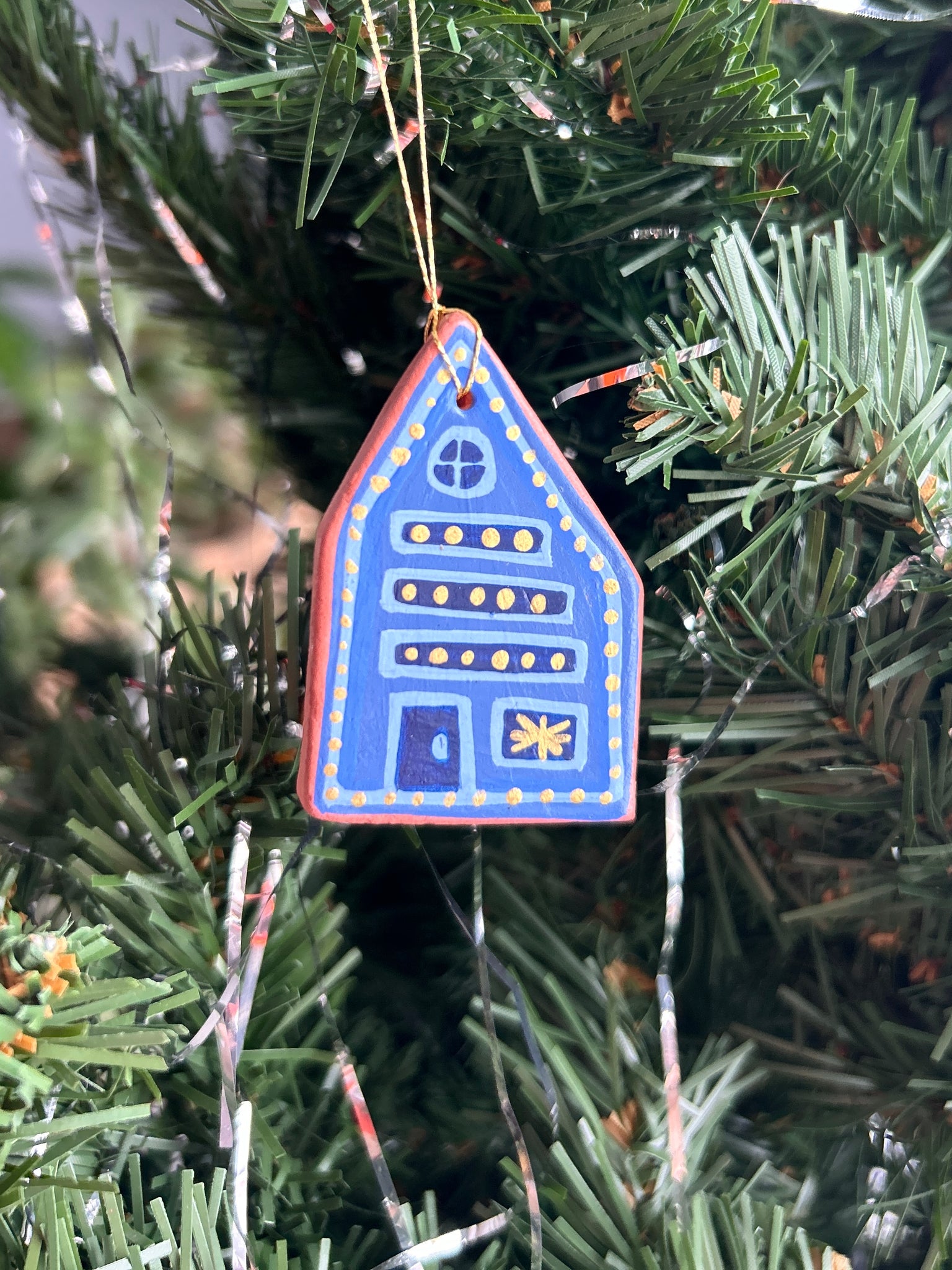 This listing is for one air dry clay house ornament, hand painted with acryla gouache and sealed with a gentle layer of satin varnish. Ready to hang on your tree, or anywhere! Completely one of a kind. Formed and painted with love, and signed and dated on the back. Please handle with care!
