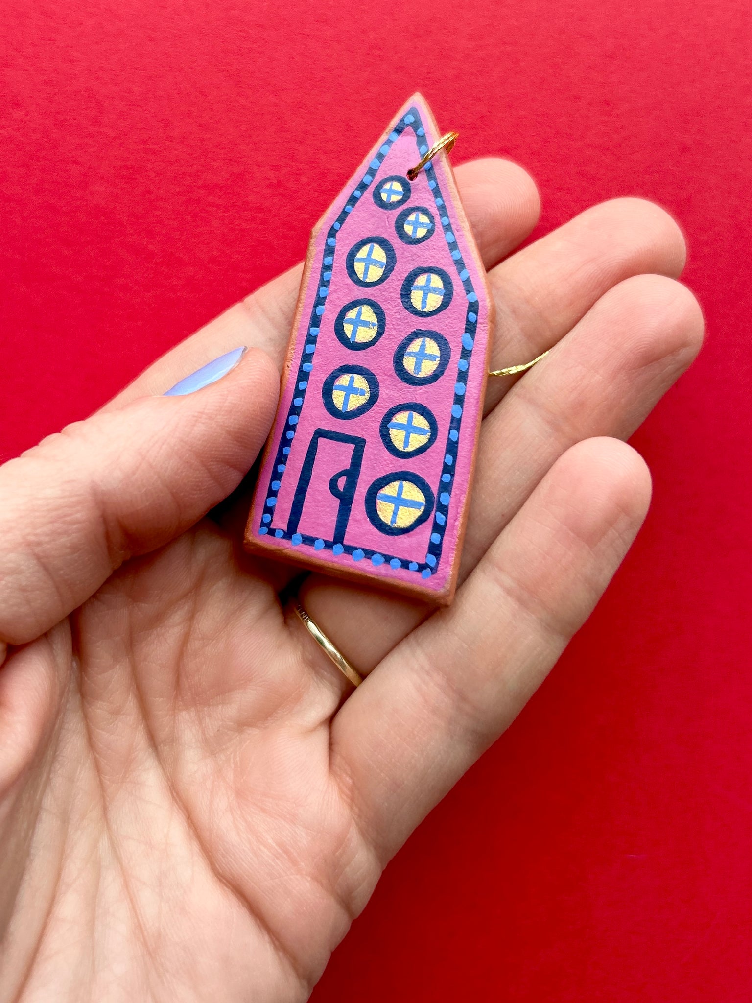 This listing is for one air dry clay house ornament, hand painted with acryla gouache and sealed with a gentle layer of satin varnish. Ready to hang on your tree, or anywhere! Completely one of a kind. Formed and painted with love, and signed and dated on the back. Please handle with care!