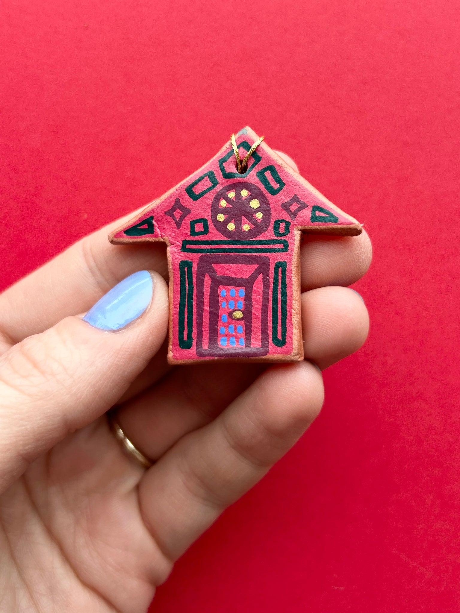 This listing is for one air dry clay house ornament, hand painted with acryla gouache and sealed with a gentle layer of satin varnish. Ready to hang on your tree, or anywhere! Completely one of a kind. Formed and painted with love, and signed and dated on the back. Please handle with care!