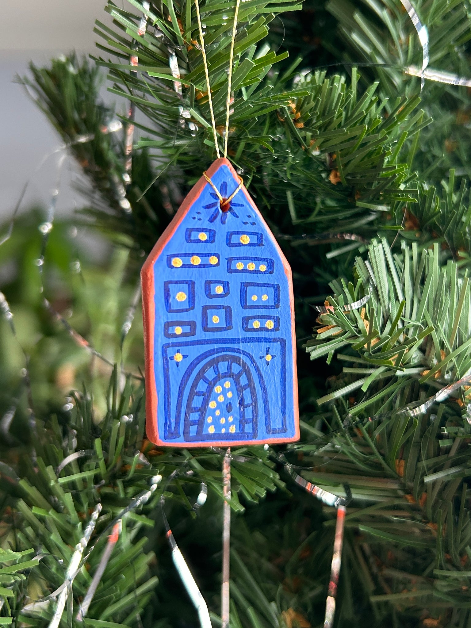 This listing is for one air dry clay house ornament, hand painted with acryla gouache and sealed with a gentle layer of satin varnish. Ready to hang on your tree, or anywhere! Completely one of a kind. Formed and painted with love, and signed and dated on the back. Please handle with care!