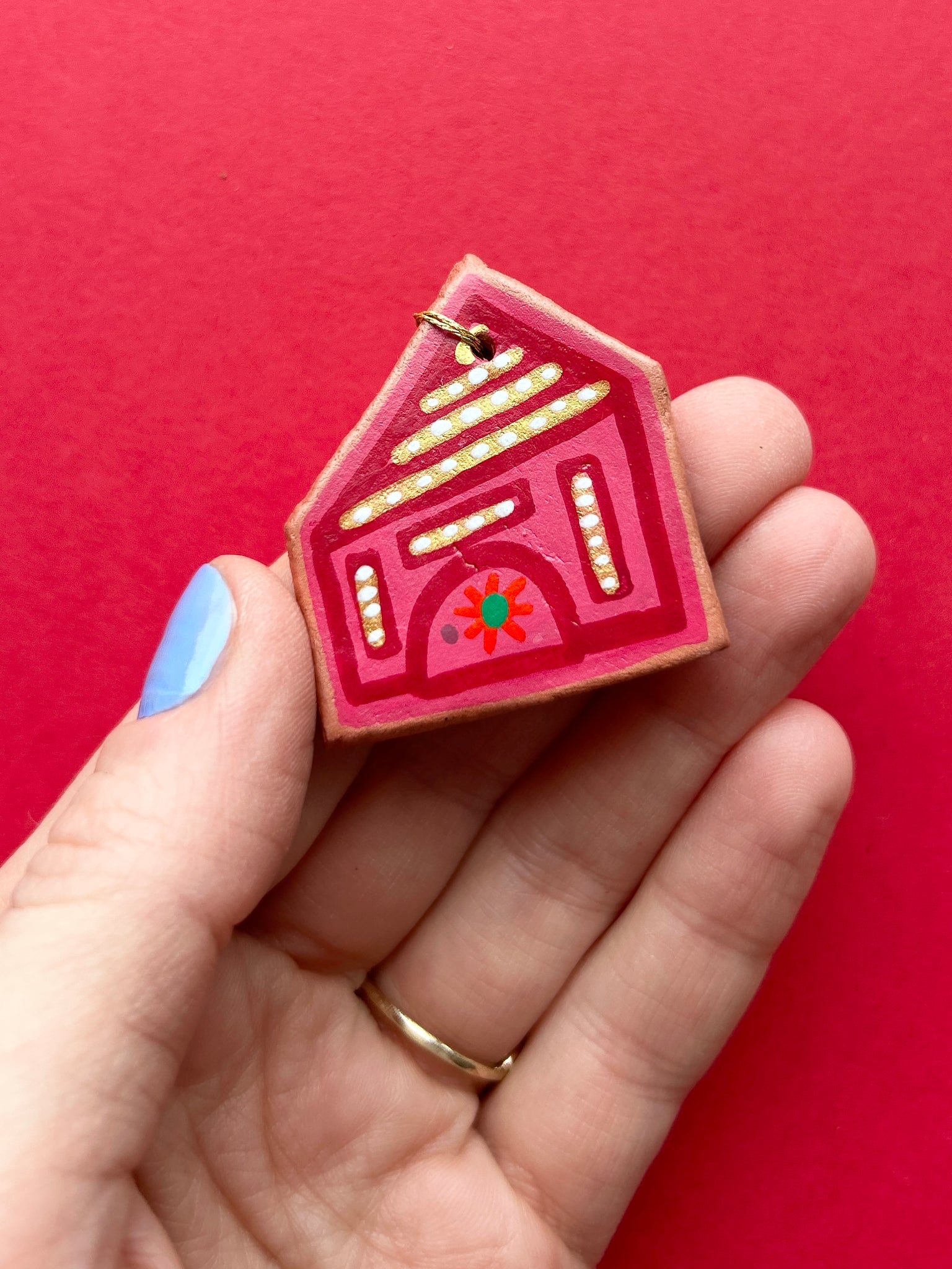 This listing is for one air dry clay house ornament, hand painted with acryla gouache and sealed with a gentle layer of satin varnish. Ready to hang on your tree, or anywhere! Completely one of a kind. Formed and painted with love, and signed and dated on the back. Please handle with care!