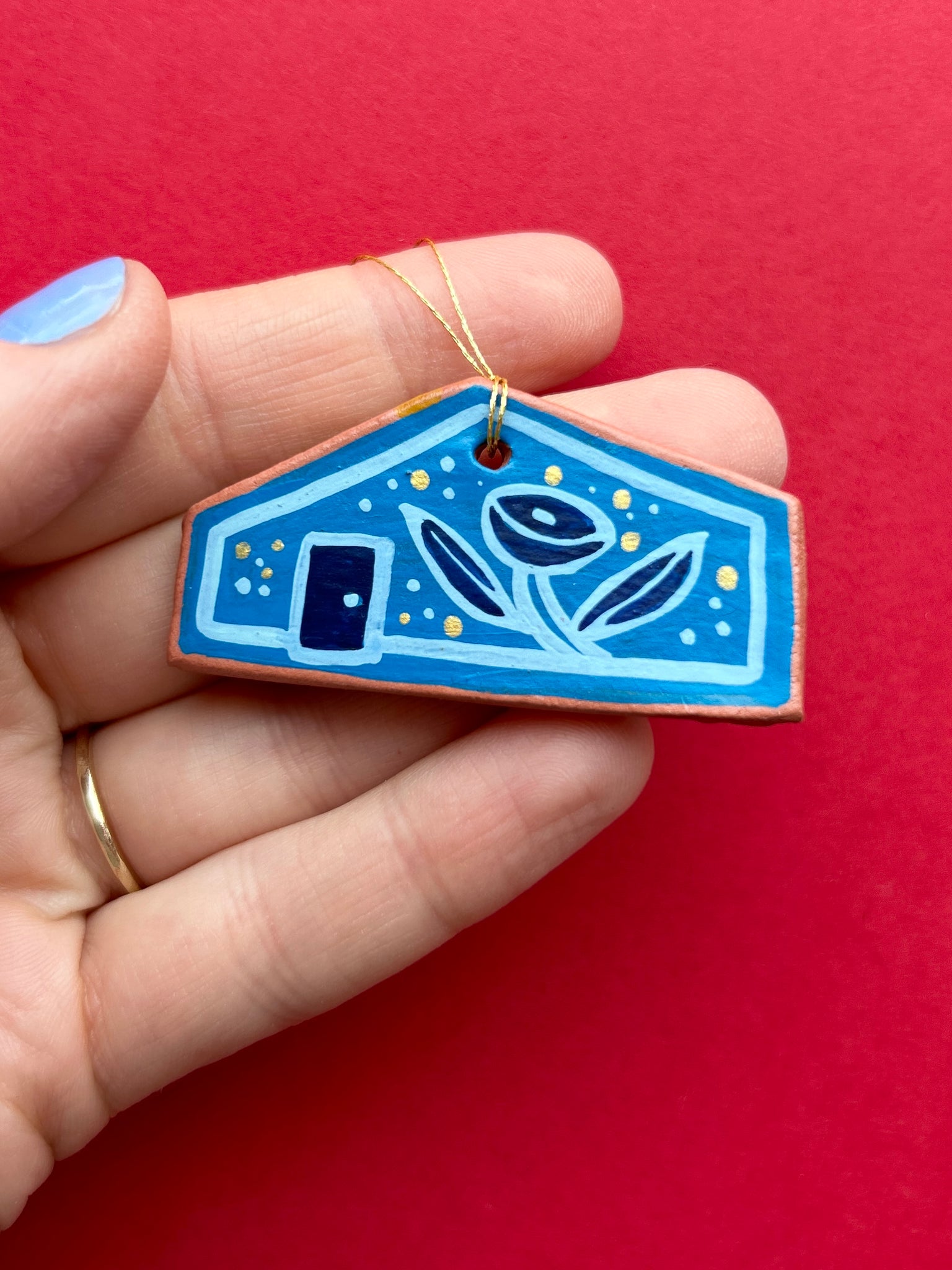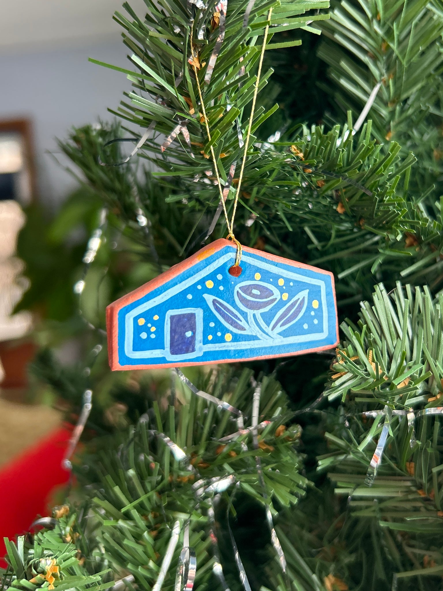 This listing is for one air dry clay house ornament, hand painted with acryla gouache and sealed with a gentle layer of satin varnish. Ready to hang on your tree, or anywhere! Completely one of a kind. Formed and painted with love, and signed and dated on the back. Please handle with care!