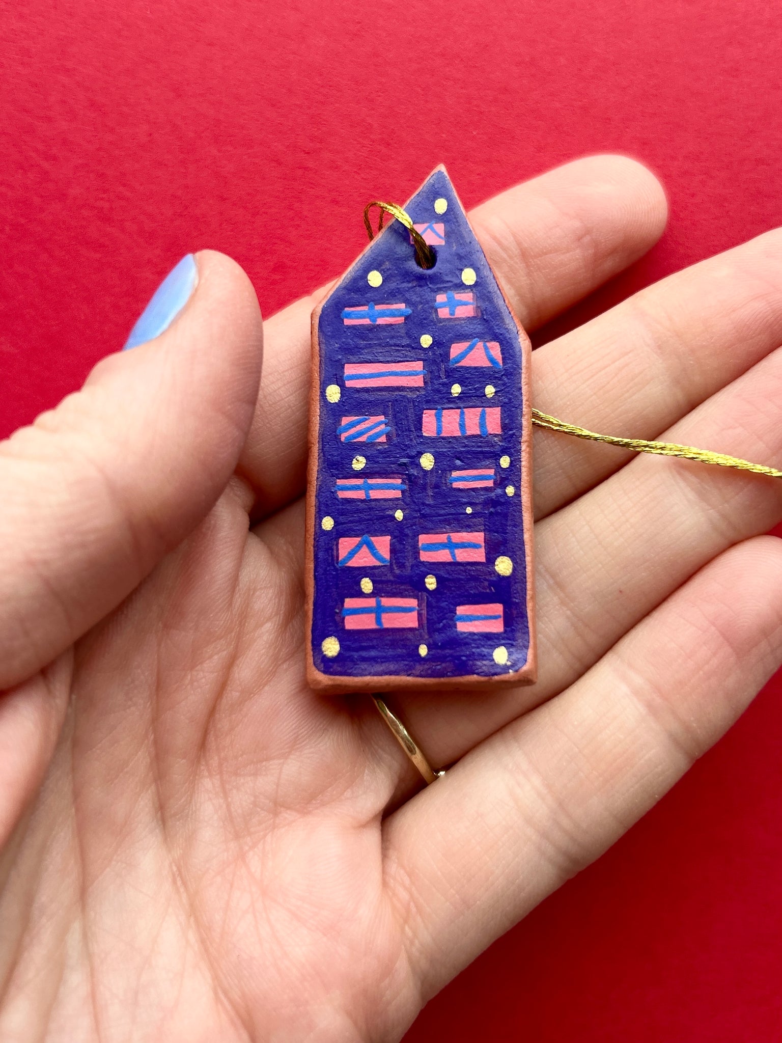 This listing is for one air dry clay house ornament, hand painted with acryla gouache and sealed with a gentle layer of satin varnish. Ready to hang on your tree, or anywhere! Completely one of a kind. Formed and painted with love, and signed and dated on the back. Please handle with care!