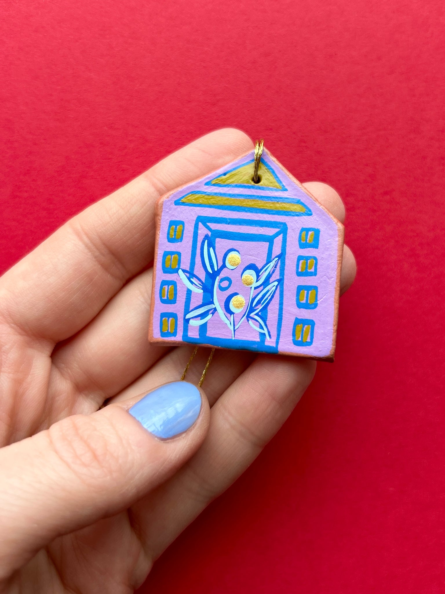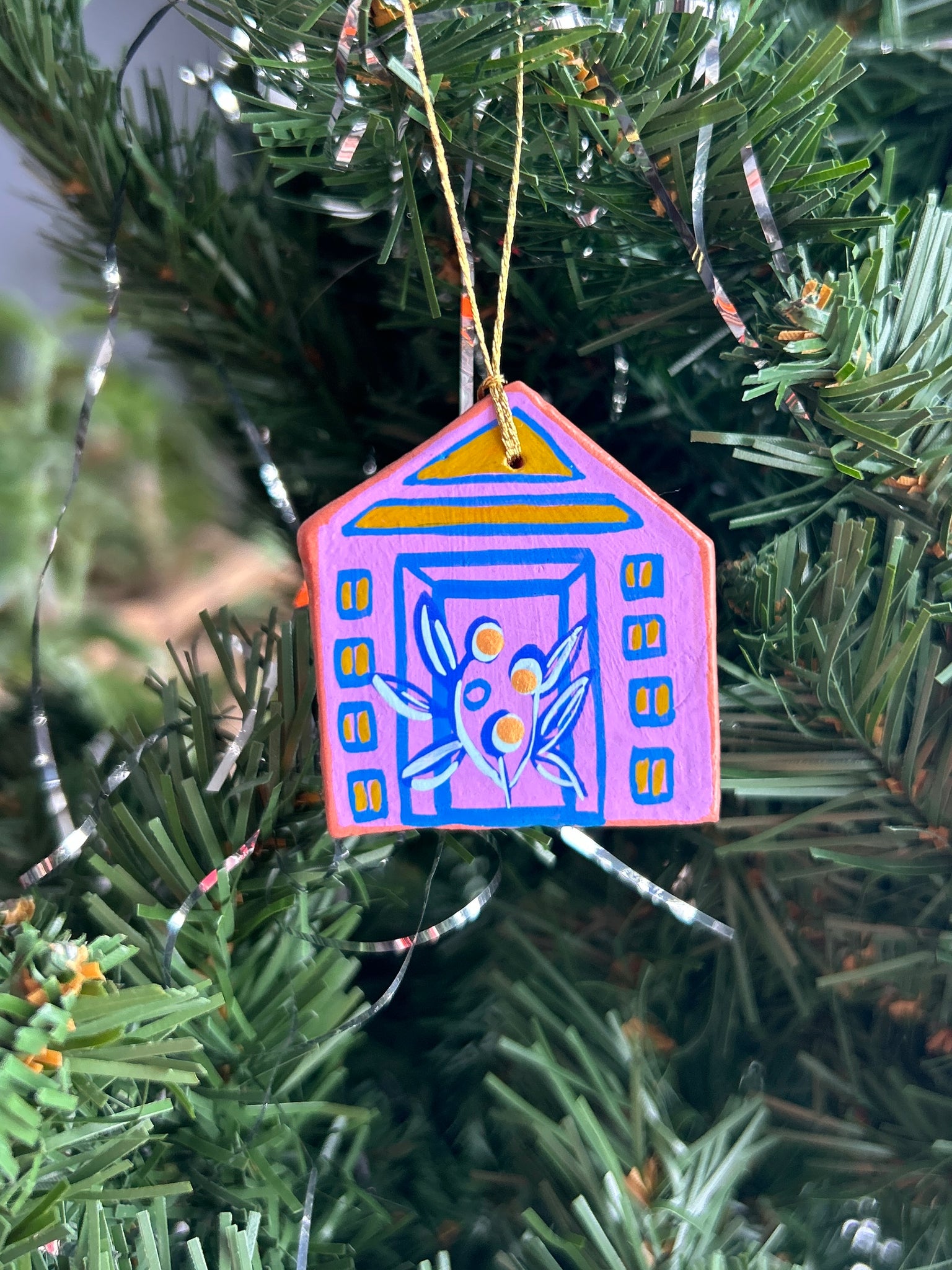 This listing is for one air dry clay house ornament, hand painted with acryla gouache and sealed with a gentle layer of satin varnish. Ready to hang on your tree, or anywhere! Completely one of a kind. Formed and painted with love, and signed and dated on the back. Please handle with care!